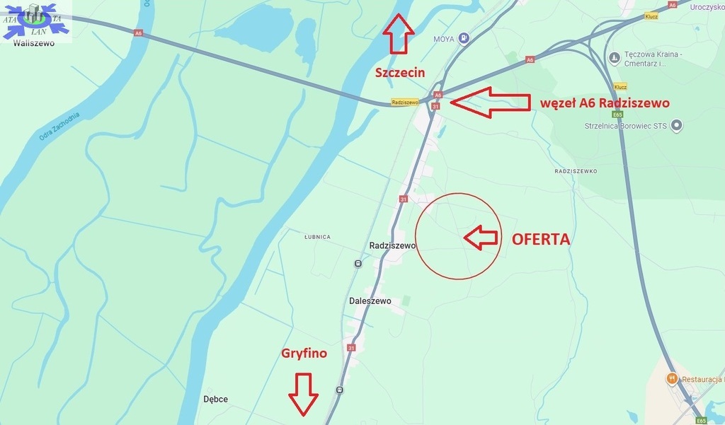Projekt podziału Działka posiada gotowy projekt podziału, który umożliwia budowę dwóch budynków w zabudowie bliźniaczej. Media Wszystkie niezbędne media prąd, gaz i woda znajdują się w drodze bezpośrednio przy granicy działki. Widok Z działki rozciąga się zachwycający widok na Dolinę Dolnej Odry, co gwarantuje przyszłym mieszkańcom unikalne walory estetyczne i relaks w otoczeniu natury. Lokalizacja Położenie łączy spokój i piękno przyrody z dogodnym dojazdem do większych miast. Do Gryfina dojedziesz w zaledwie 10 minut, a do Szczecina w około 20 minut. Do węzła A6 Radziszewo - ok 5 min.
