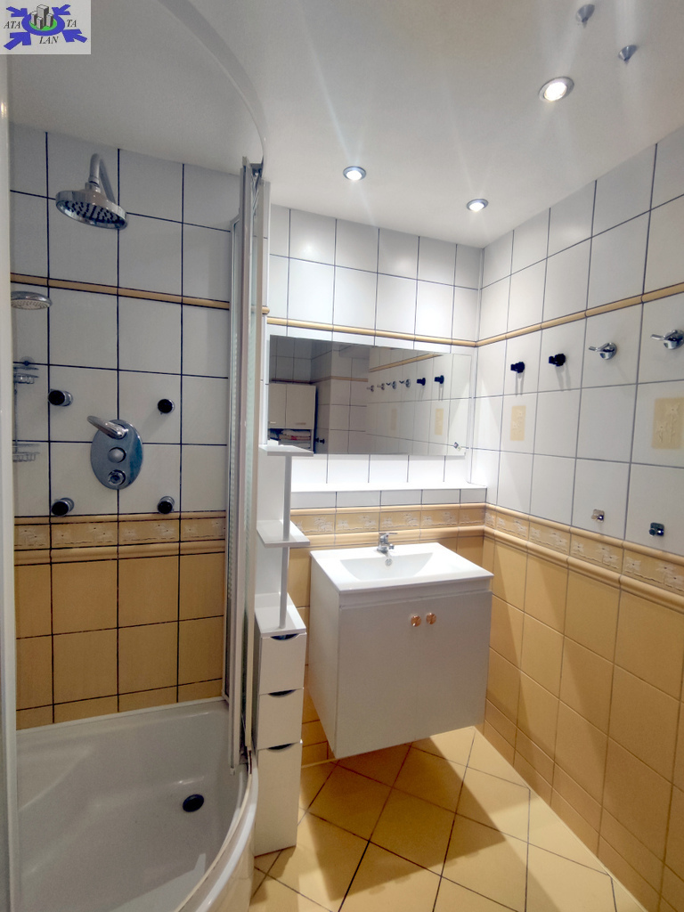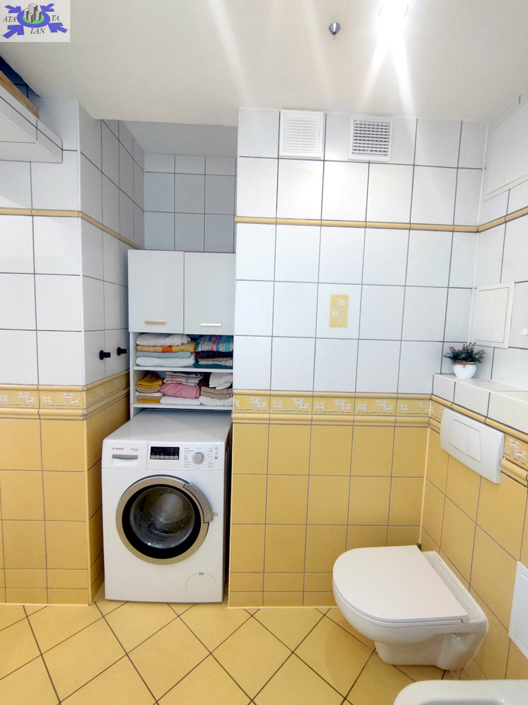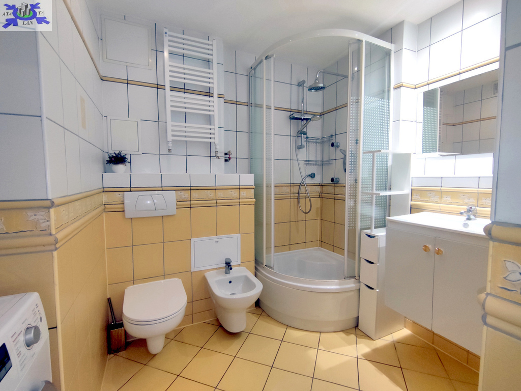 W łazience nowa kabina prysznicowa, toaleta, bidet oraz wydzielone miejsce na pralkę.