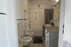Łazienka wyłożona płytkami ceramicznymi w niej umywalka, wanna, pralka, WC razem.