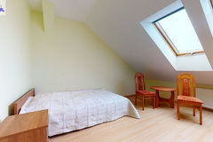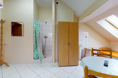 - w budynku wydzielona jest część hotelowa- parter (hol, aneks kuchenny, 9 pokoi 2 i 3 osobowych, 2 łazienki wyposażone po 2 kabiny prysznicowe, 4 toalety, korytarz). Nad częścią hotelową znajduje się poddasze (hol, kuchnia z jadalnią, toaleta, 4 pokoje w tym 3 z kabinami natryskowymi i umywalkami).