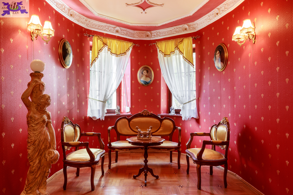 Wnętrza urzekają eleganckim stylem wiktoriańskim - mahoniowe meble, złocone lustra, stylowe tapety oraz drewniane parkiety w geometryczne wzory tworzą unikalny klimat.