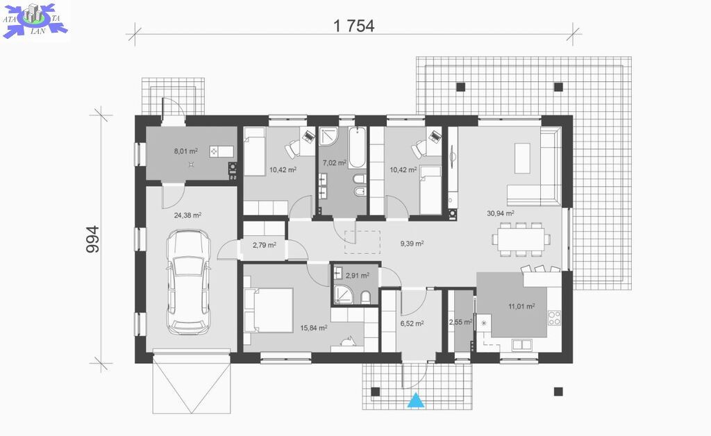 - garaż - 24,38 m2.