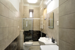 - Łazienka o pow. ok. 10 m2, uposażona w kabinę prysznicową, umywalkę oraz WC, pralkę, w glazurze oraz terakocie.