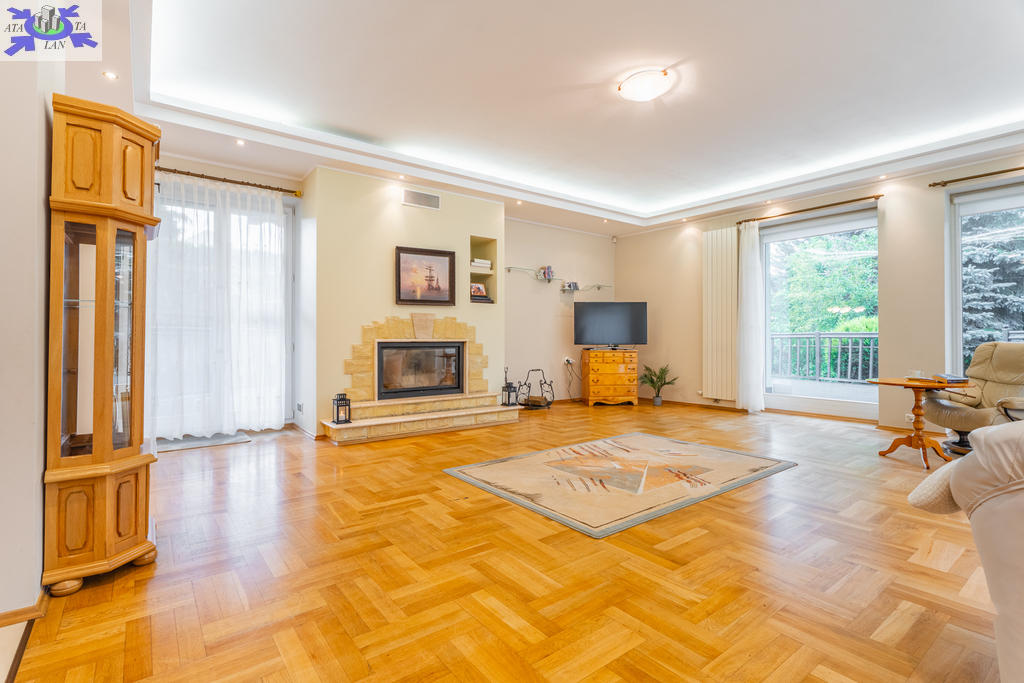 Przestronny, jasny salon z dębową podłogą, antywłamaniowymi oknami trzyszybowymi z kominkiem (67 m2) i wyjściem na taras (73 m2)