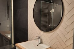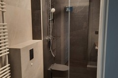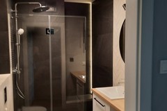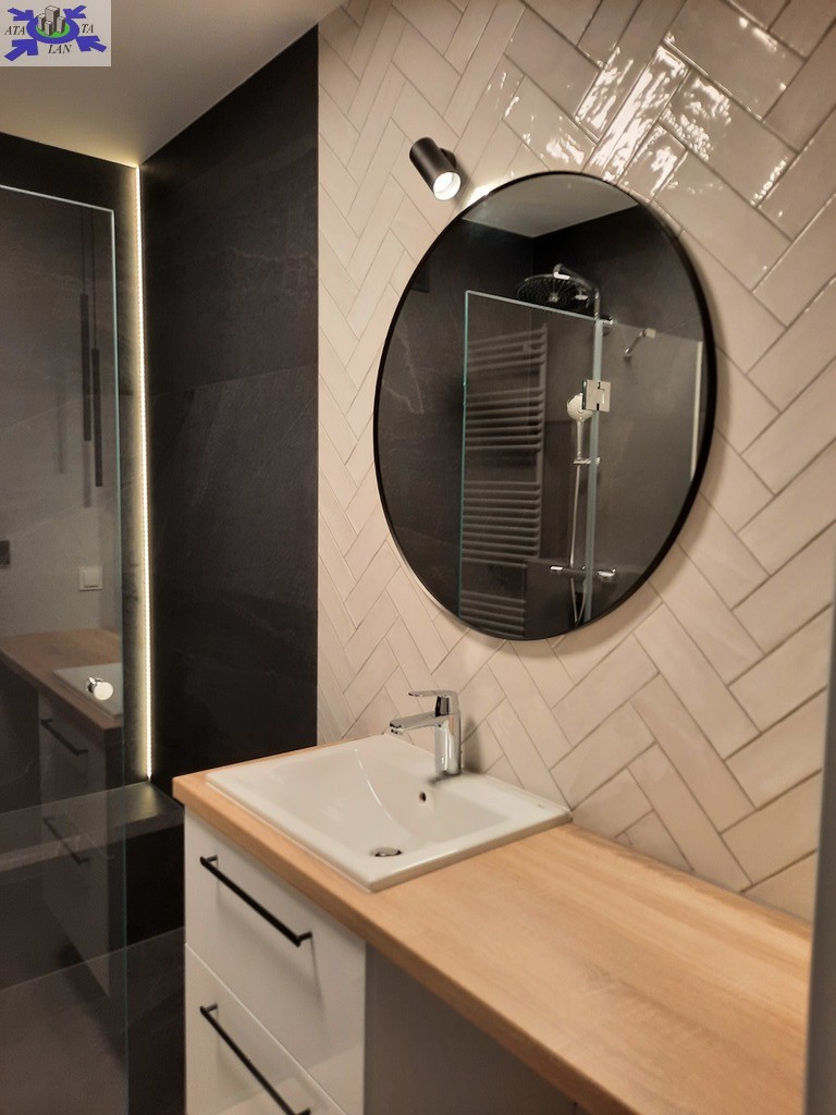 Parawan prysznicowy szklany typu "walk in", bateria termostatyczna, deszczownica oraz osobna słuchawka prysznicowa firmy Grohe, odpływ liniowy w posadzce. Umywalka z szafką 60 cm (2 szuflady), blat drewniany, bateria firmy Grohe. Lustro z kinkietem. Przyłącze do pralki. WC na stelażu w zabudowie z gresu. Drzwi łazienkowe firmy Polskone, typ Fiord, klamki czarne.