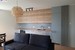 Ściany i sufity gładź, pomalowane farbami Flugger. Panele podłogowe wodoodporne firmy Meister. Listwy przypodłogowe z płyty MDF wysokości 8 cm. Karnisze sufitowe wraz z zasłonami IKEA Majgul. Sofa 3-osobowa rozkładana z funkcją spania i pojemnikiem na pościel LUKAS - AGATA MEBLE. Dywan. Stolik kawowy z półką drewnianą - IKEA HEMNES. Szafka RTV drewniana - IKEA HEMNES.