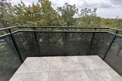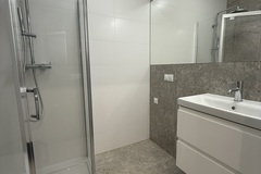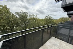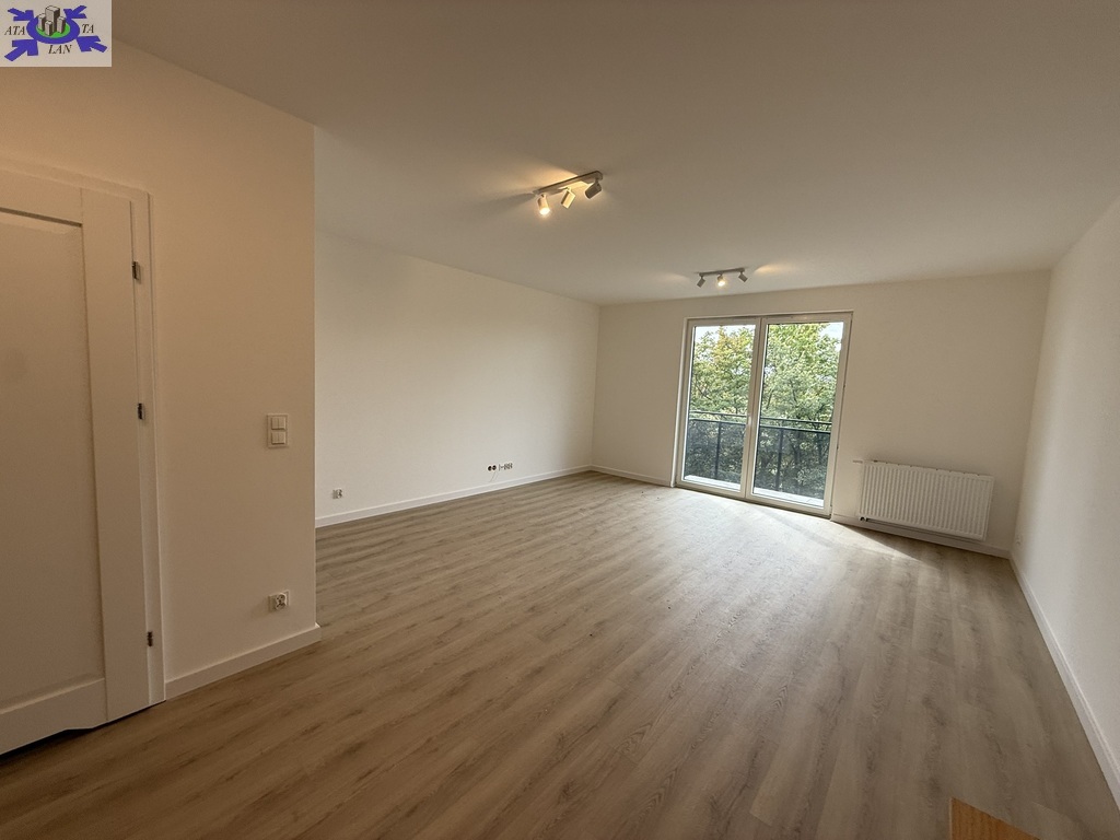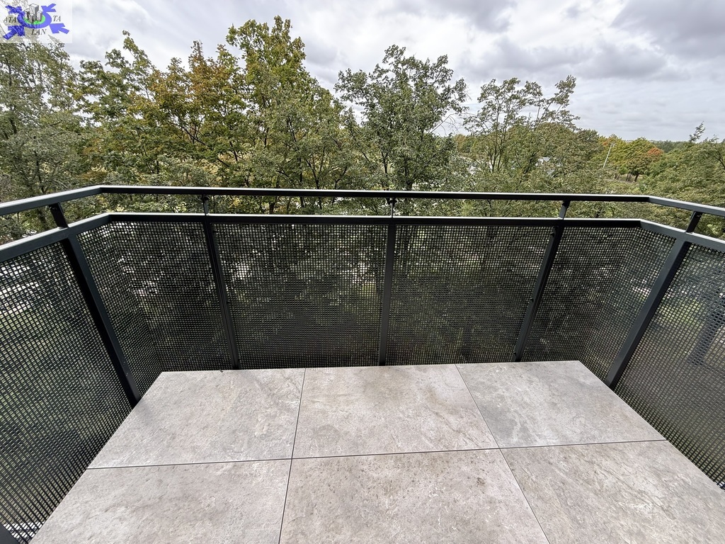 Układ przestronny salon z aneksem kuchennym, łazienka z prysznicem, balkon z widokiem na zieleń