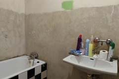 - Podłogi panele, stary parkiet ze znacznymi obszarami ubytków, zniszczone lub ich brak, w łazienkach podłoże betonowe, zerwane płytki posadzki, w jednej łazience stare kafle i terakota.