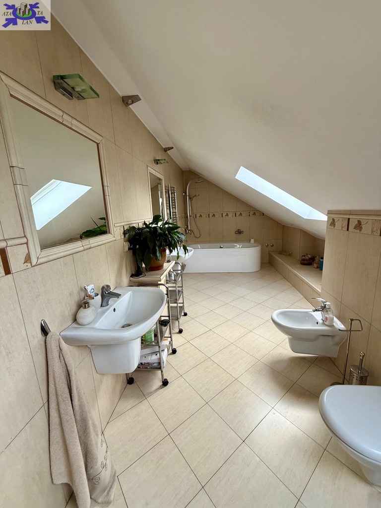 Na parterze znajdziesz także pierwszą łazienkę oraz pomieszczenia gospodarcze. Na piętrze rozplanowano cztery sypialnie oraz drugą łazienkę.