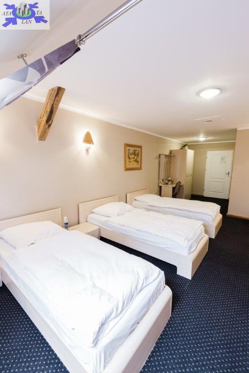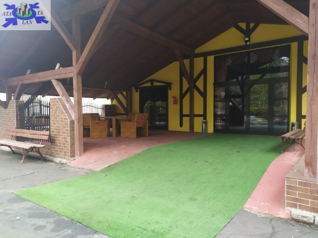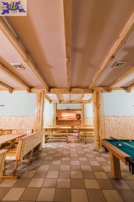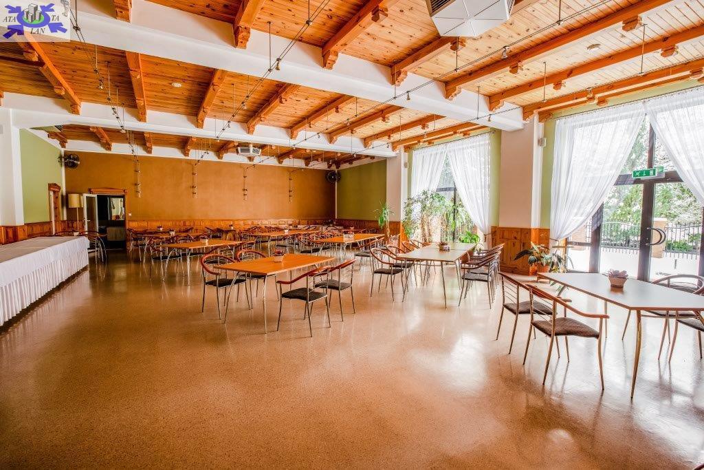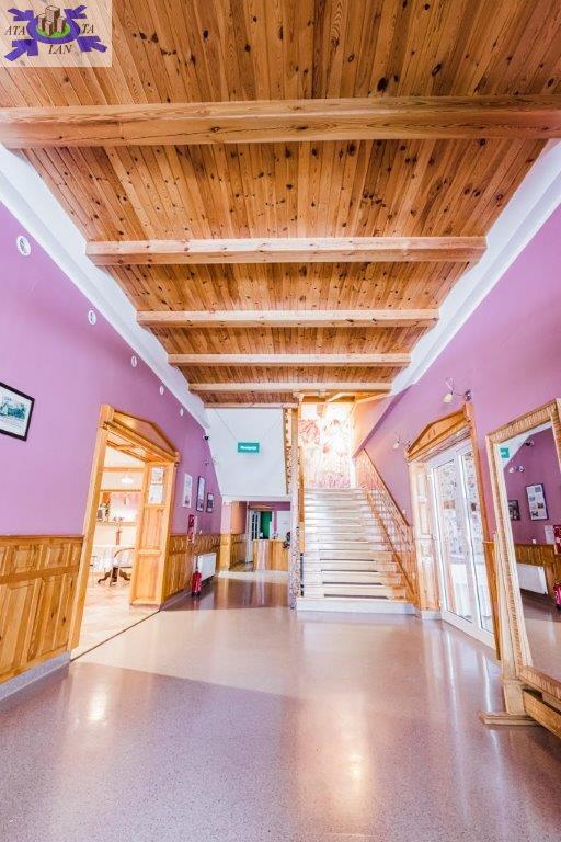 recepcja,duża jadalnia (ok. 290 m2) oraz wspólna kuchnia z kilkunastoma stanowiskami,profesjonalne zaplecze gastronomiczne kuchnia hotelowa, magazynki, chłodnie,pralnia samoobsługowa z systemem płatności,toalety, suszarnia, kotłownia,przestrzeń garażowo-warsztatowa z piecem, o pow. ok. 490 m2.I piętro