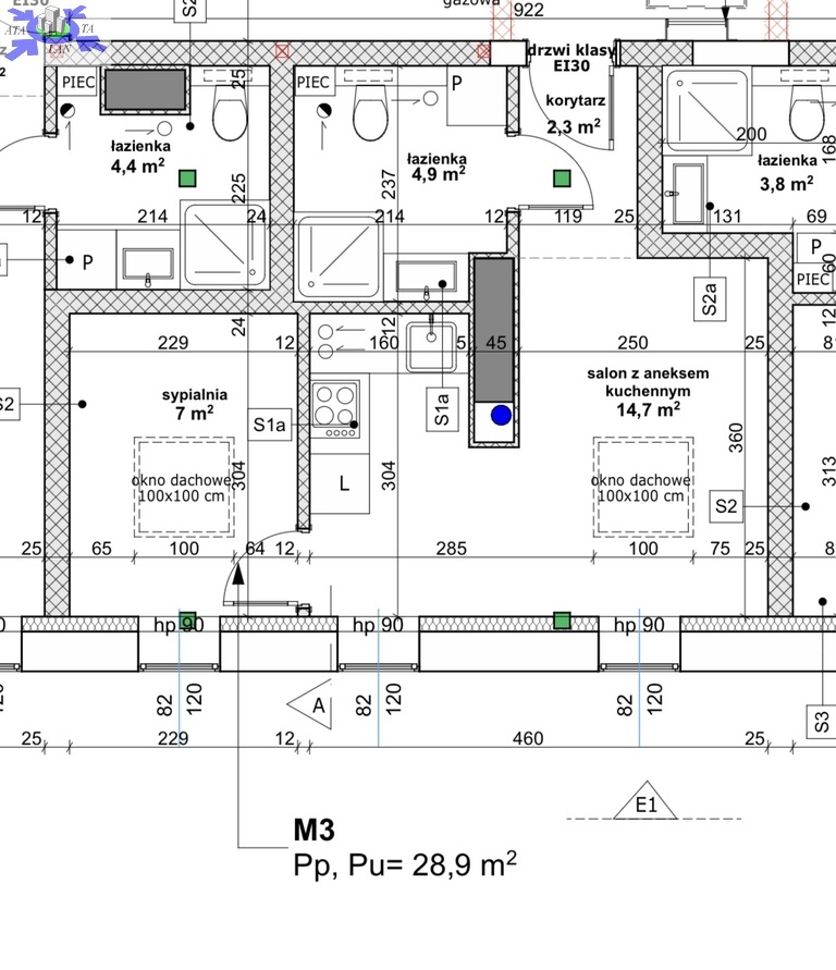 salon z aneksem kuchennym 14,7 m2sypialnia 7,0 m2łazienka 4,9 m2korytarz 2,3 m2