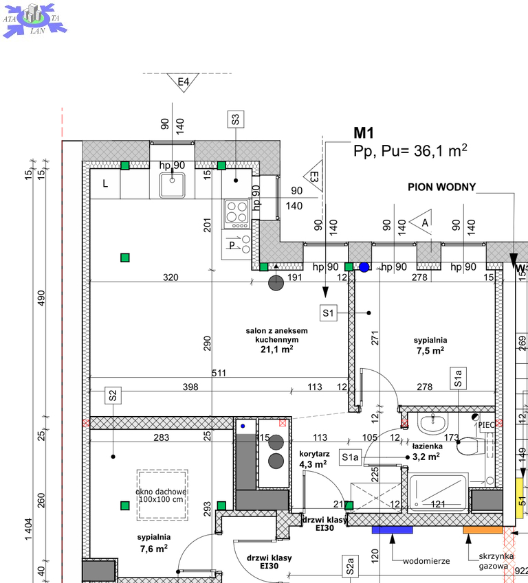 salon z aneksem kuchennym 21,1 m2sypialnia 7,5 m2łazienka 3,2 m2korytarz 4,3 m2