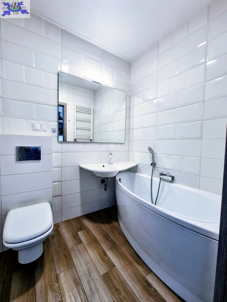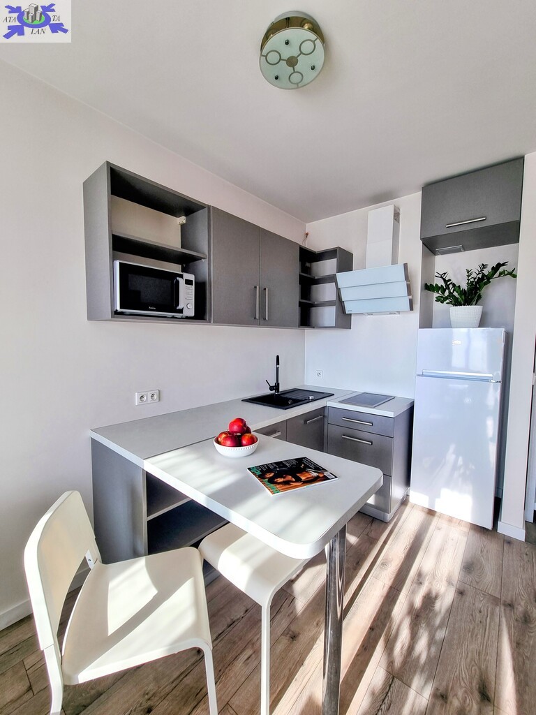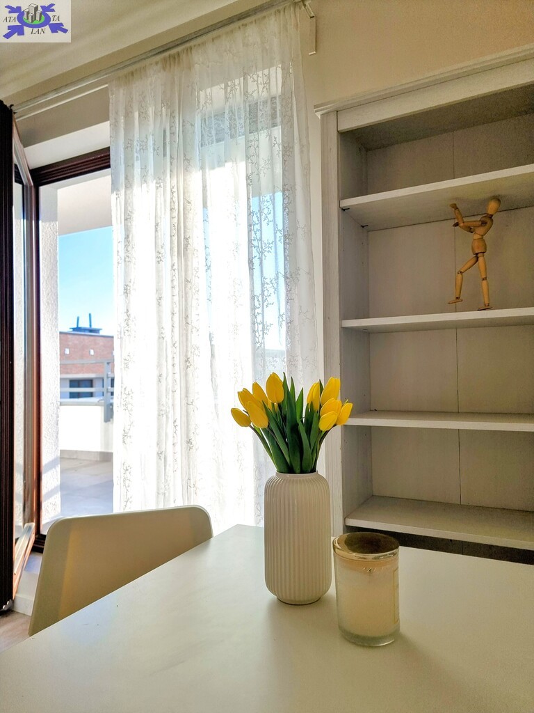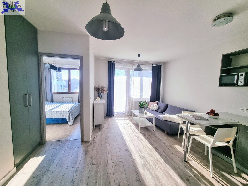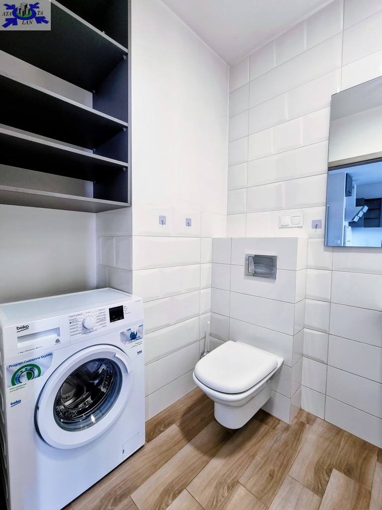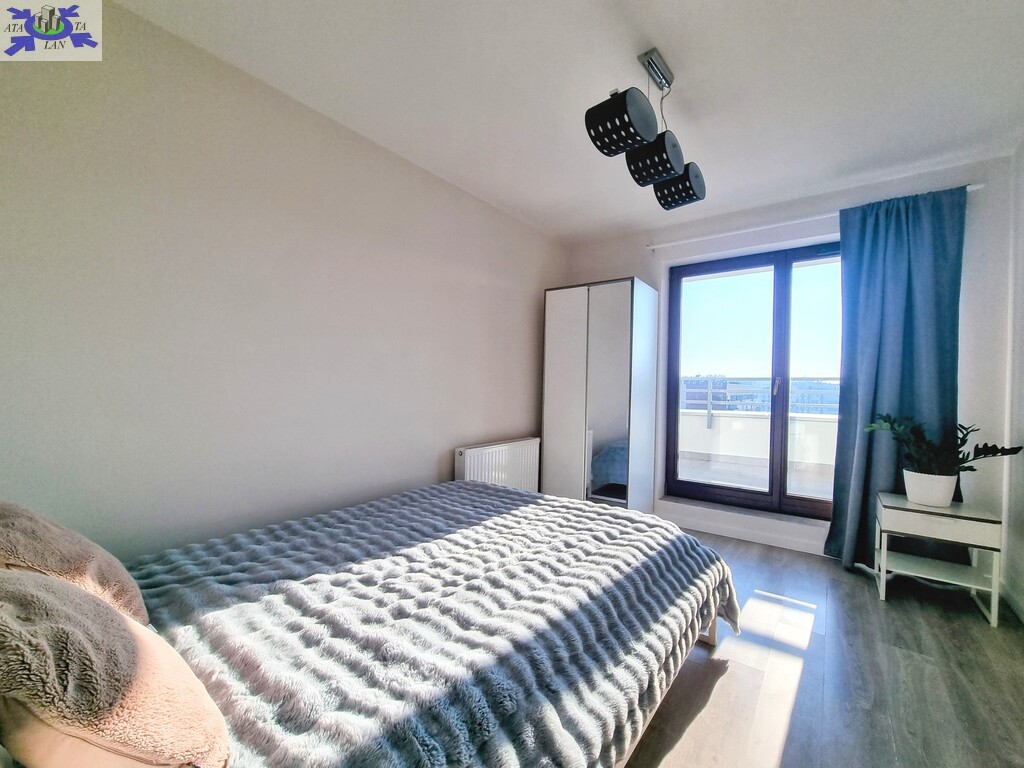 Kuchnia wyposażona w meble w zabudowie oraz sprzęt AGD lodówka z zamrażalką, płyta grzewcza, okap, zmywarka, mikrofalówka. W łazience narożna wanna, umywalka, toaleta, pralka. W sypialni znajduje się w duże łóżko, komodę oraz szafę w zabudowie. Salon mieści kanapę, stolik kawowy oraz stół z krzesłami. Z salonu również wyjście na balkon. Dodatkowo do dyspozycji są dwie szafy - jedna przy salonie, druga we wspólnym przedpokoju.