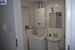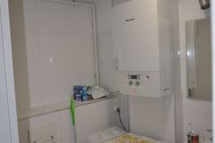 Łazienka z WC o powierzchni ok. 3 m2 została wykończona glazurą i terakotą. Znajduje się w niej kabina prysznicowa, piec dwuobiegowy marki Junkers oraz umywalka.