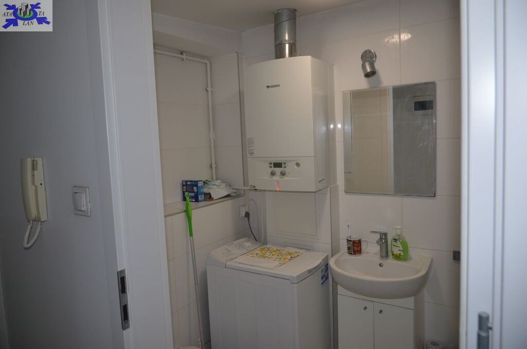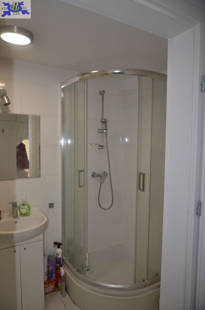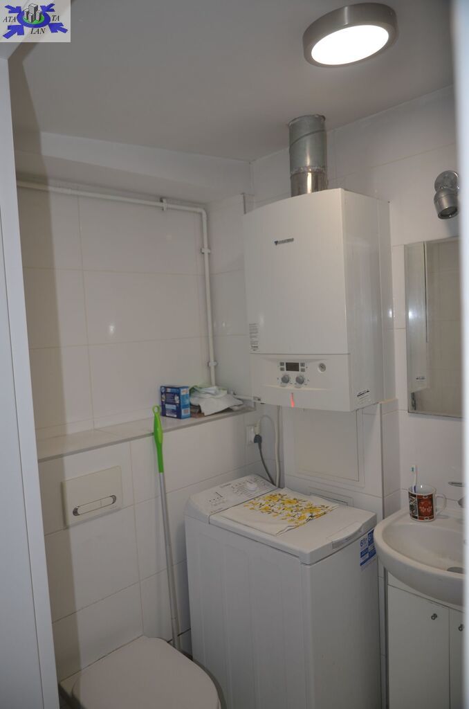Łazienka z WC o powierzchni ok. 3 m2 została wykończona glazurą i terakotą. Znajduje się w niej kabina prysznicowa, piec dwuobiegowy marki Junkers oraz umywalka.