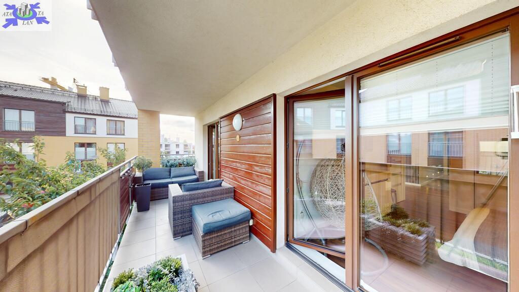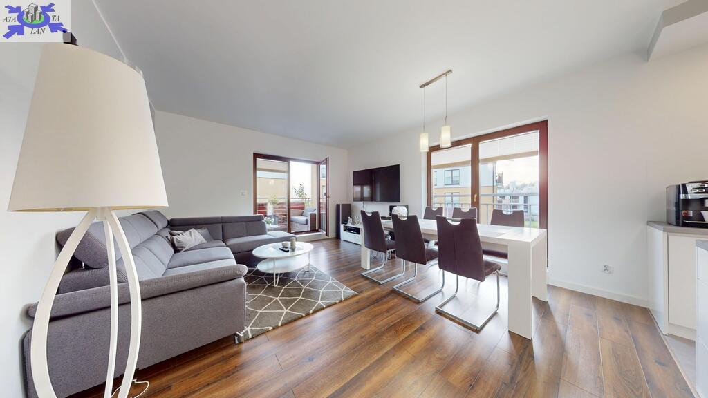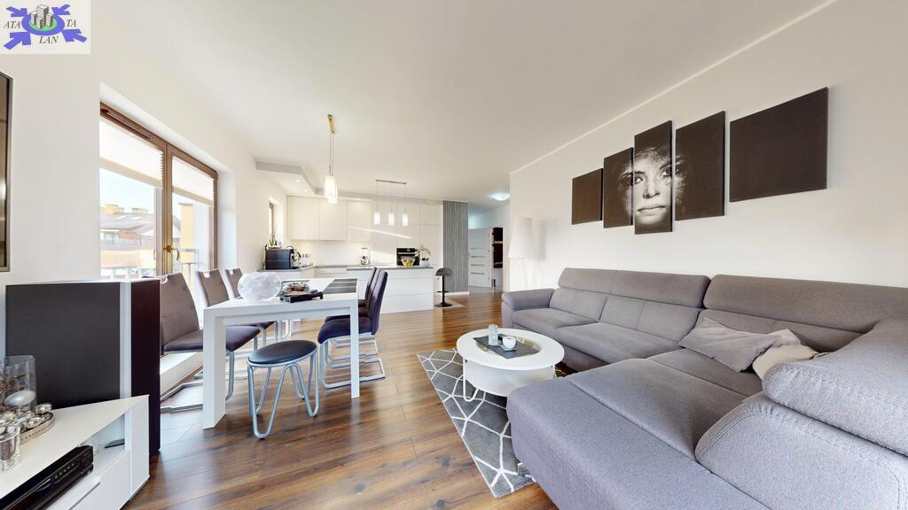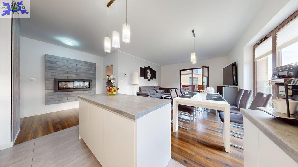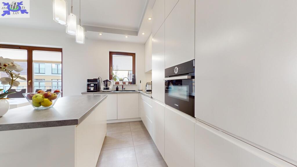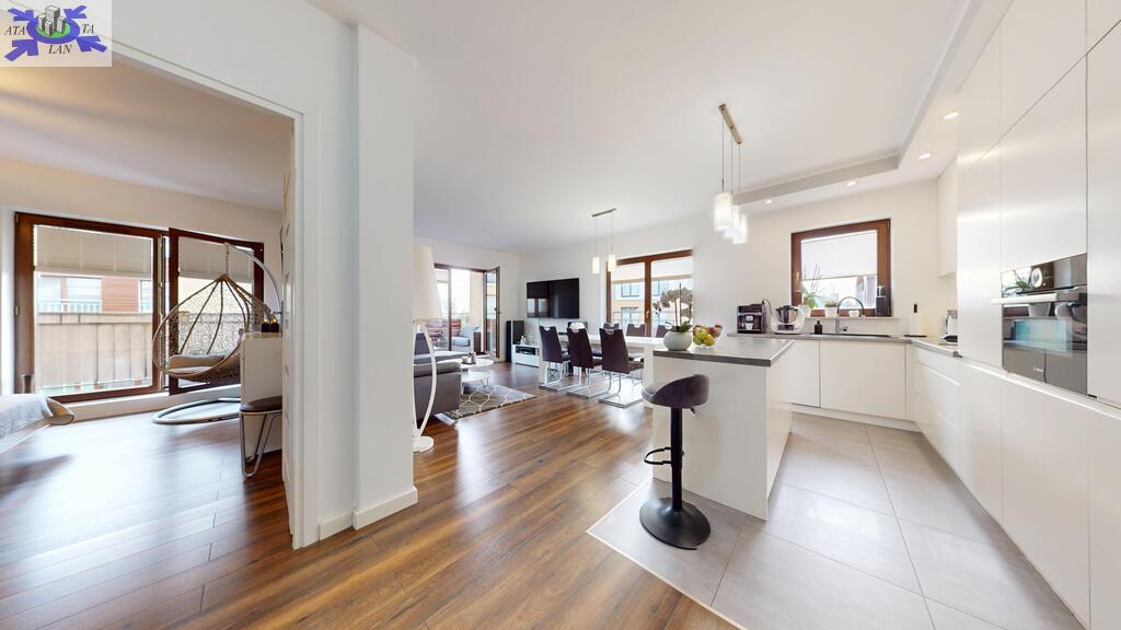 - przestronny, niesamowicie doświetlony salon z aneksem kuchennym. Zabudowa kuchenna aż do sufitu, wysokiej jakości, robiona na wymiar wraz z wyspą. Z salonu wychodzi się na bardzo słoneczny taras z południową wystawą,