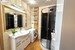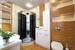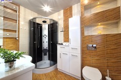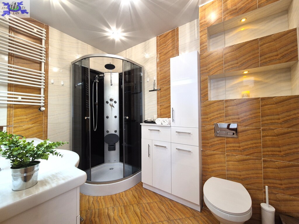 Łazienka w glazurze i terakocie z oświetleniem sufitowym, na wyposażeniu umywalka, podwieszana miska wc oraz kabina prysznicowa z hydromasażem.