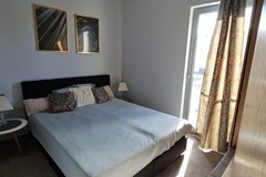 Przestronny salon z aneksem kuchennym łączy funkcjonalność z elegancją, a duże przeszklenia zapewniają doskonałe doświetlenie wnętrza. Dwie sypialnie i dwie stylowe łazienki sprawiają, że apartament jest idealny zarówno do prywatnego użytku, jak i do wynajmu premium.