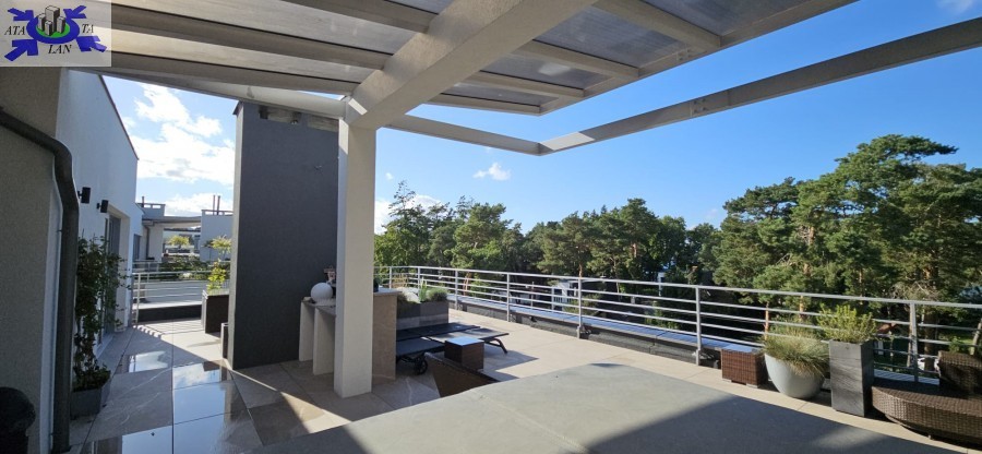 Prywatna winda wjeżdża bezpośrednio do apartamentu, a jego prawdziwym sercem jest taras o powierzchni około 80 m2. To przestrzeń do relaksu i spotkań w gronie bliskich - z częścią wypoczynkową, zadaszoną jadalnią i własnym jacuzzi z widokiem na korony drzew.