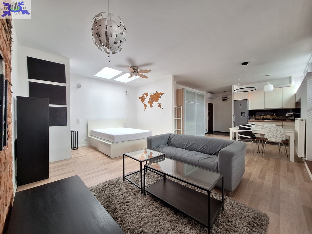 Mieszkanie dzięki otwartej przestrzeni i metrażowi daje duże możliwości aranżacyjne, w tym możliwość wydzielenia strefy sypialnianej. W kuchni znajdują się meble w zabudowie oraz piekarnik z funkcją mikrofali.