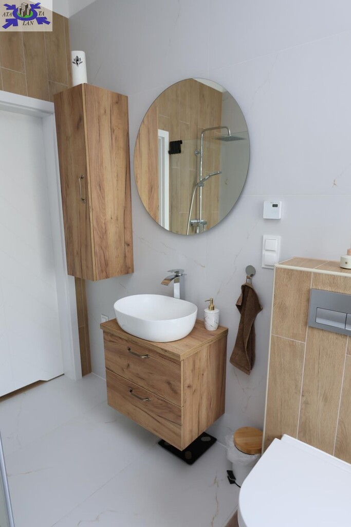 Funkcjonalny układ domu, nadający się dla 2 lub 3 osobowej rodziny, z przyjemnym wnętrzem, wykończony materiałami bardzo dobrej jakości.