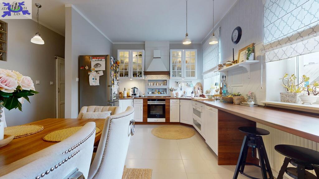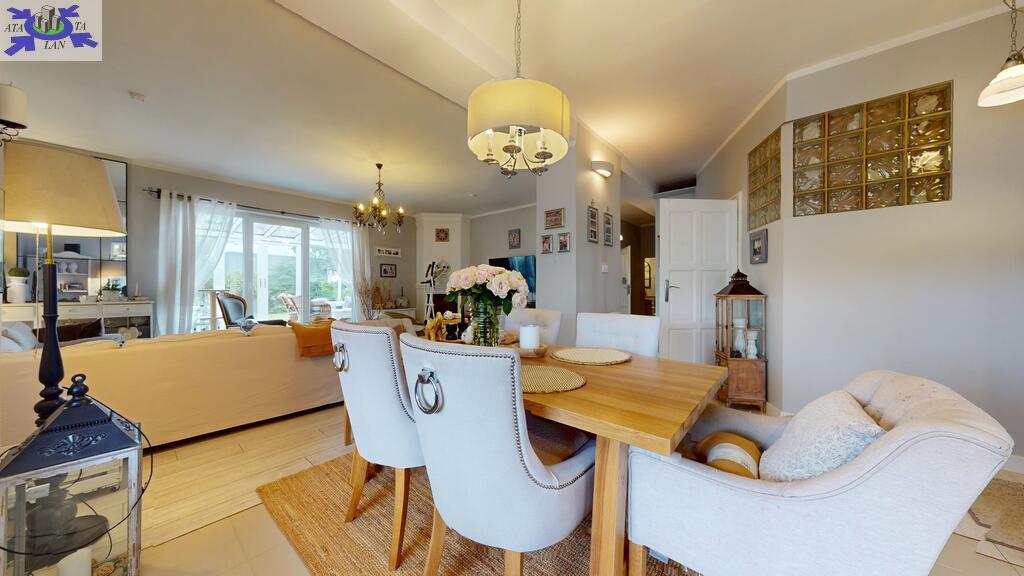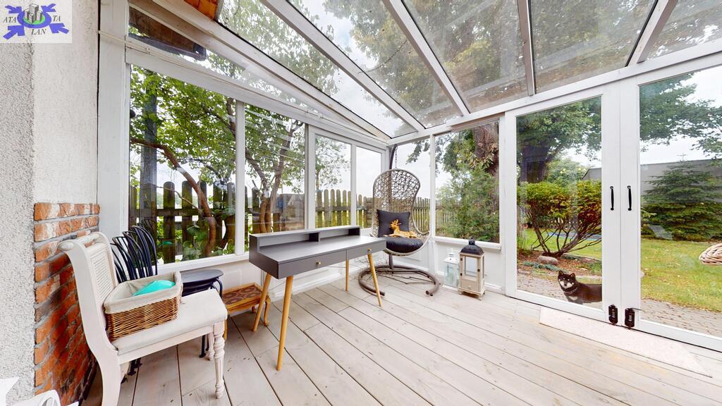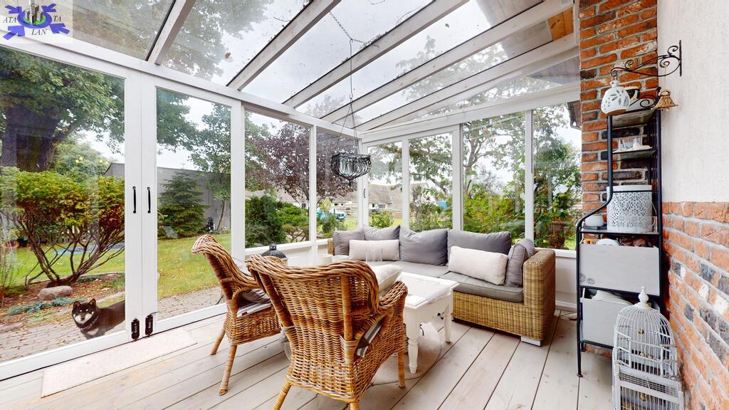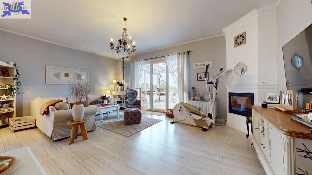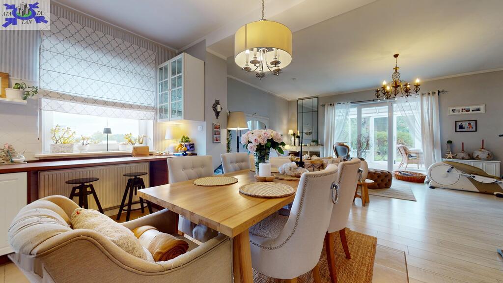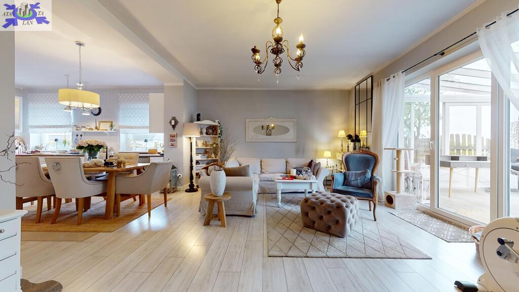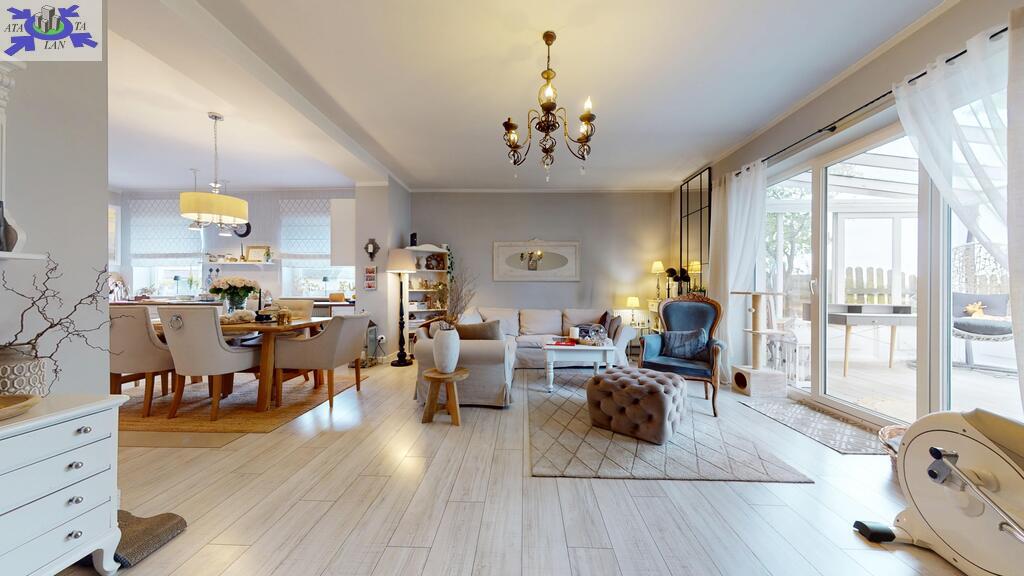- przestronnego salonu z otwartą kuchnią, z wyjściem na taras zimowy,