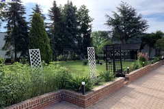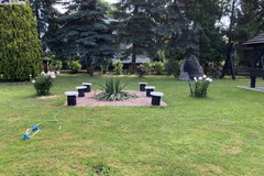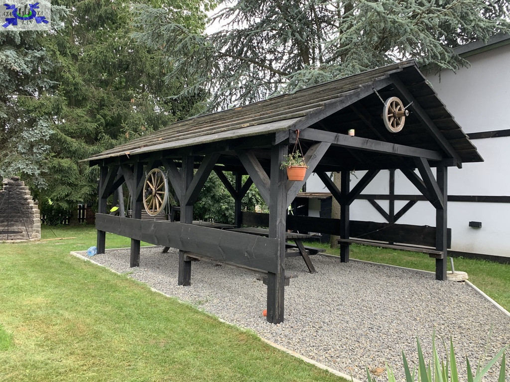 Teren wokół domu zadbany, regularnie pielęgnowany, zorganizowana strefa wypoczynku z dużą wiatą i grillem oraz huśtawką.