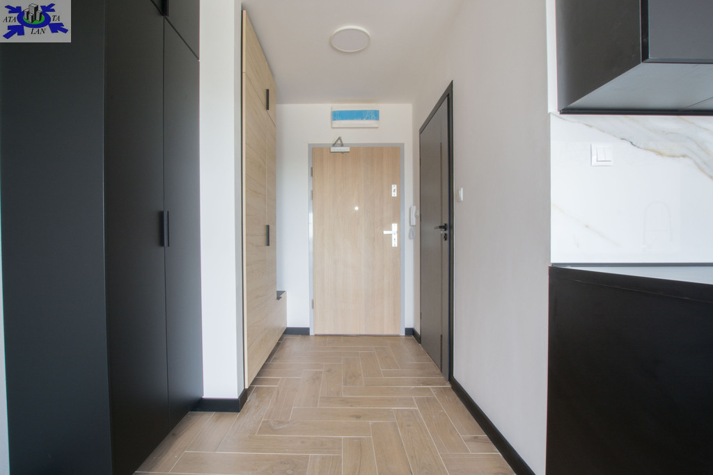 W przedpokoju dwie duże szafy z półkami oraz miejscem na wieszaki oraz szafka z siedziskiem dla wygodnego ubierania butów.