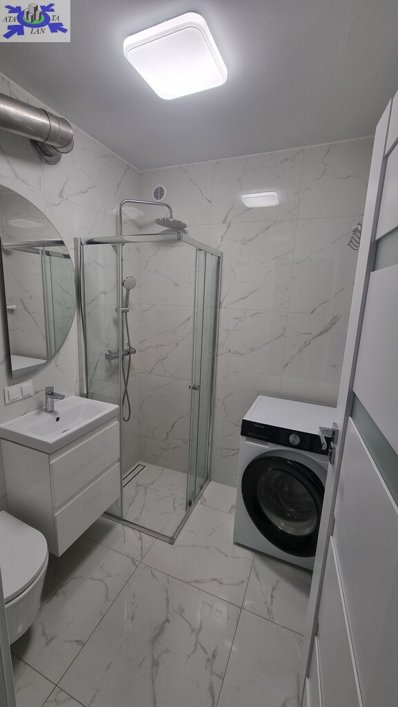 - w łazience kabina prysznicowa z pralko suszarką.