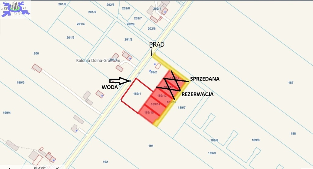 Do działki poprowadzony jest PRĄD oraz WODA z sieci gminnej.