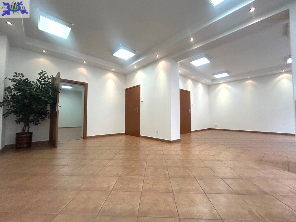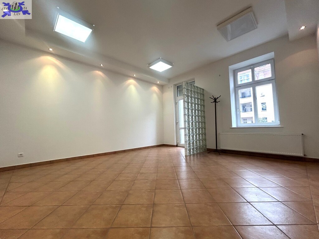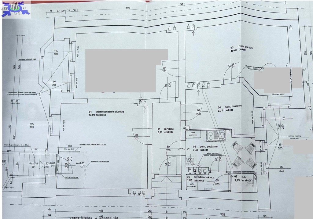 - pomieszczenie biurowe od frontu (pow. 43,90 m2) z wydzielonymi dwoma strefami (pierwsza z wejściem z ulicy, druga z balkonem), na podłodze terakota, okna PCV, rolety zewnętrzne, przegroda ze szklanej cegły przy wejściu