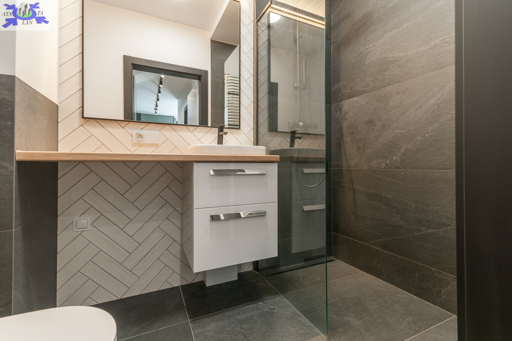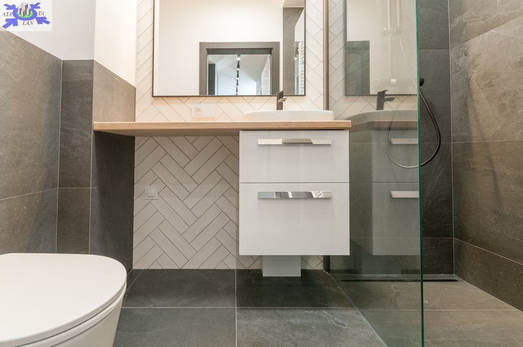 * łazienka wykończona w kaflach, z kabina prysznicową typu walk-in zabudowany geberit, szafka z umywalką,