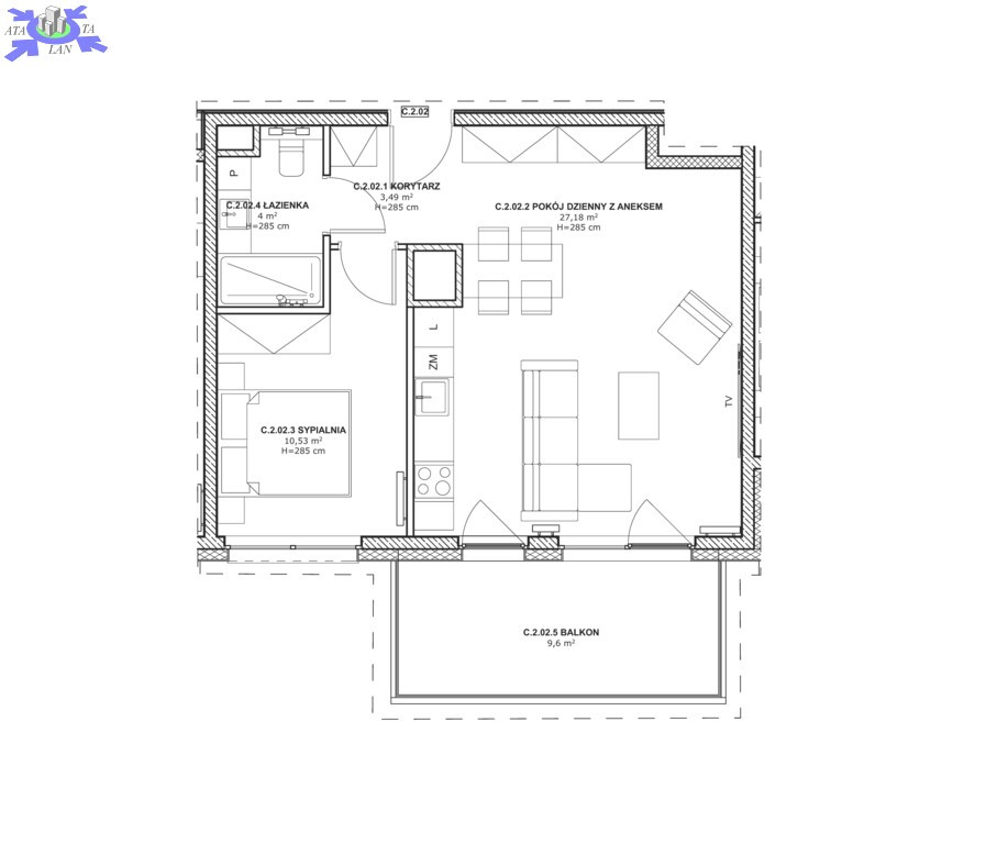 - pokoju dziennego z aneksem o powierzchni 27,18 m2 z wyjściem na balkon - 10 m2