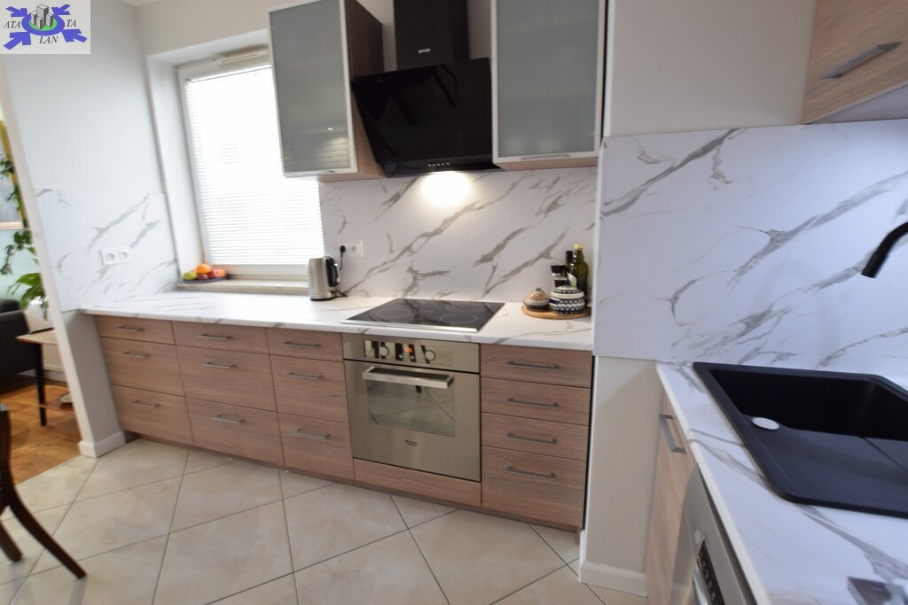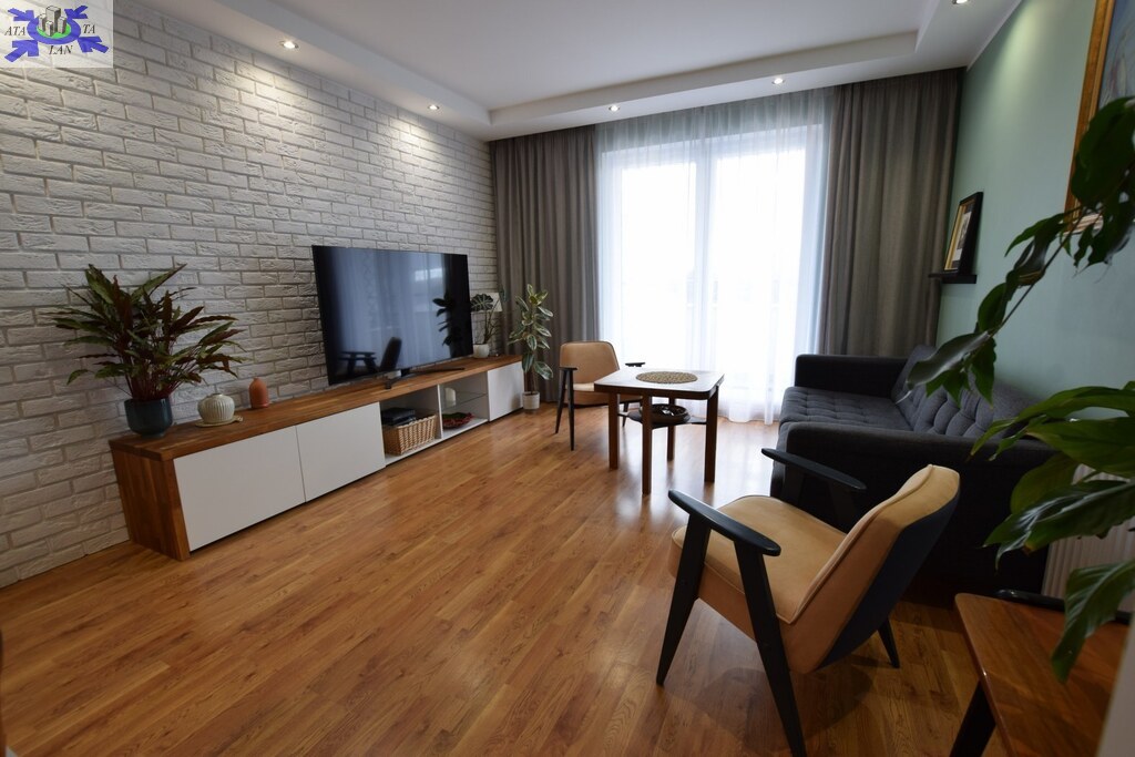 Mieszkanie urządzone zgodnie z nowoczesnymi trendami wyposażenia wnętrz o bardzo korzystnym układzie pomieszczeń (odseparowana część sypialna od salonu i kuchni).