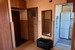 Na podłodze panele i kafle, na ścianach tapeta. Łazienka z kabiną prysznicową wykończona w glazurze i terakocie.