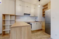 Pokój z aneksem kuchennym i wyjściem na balkon. Łazienka razem z wc, w przedpokoju szafa w zabudowie.