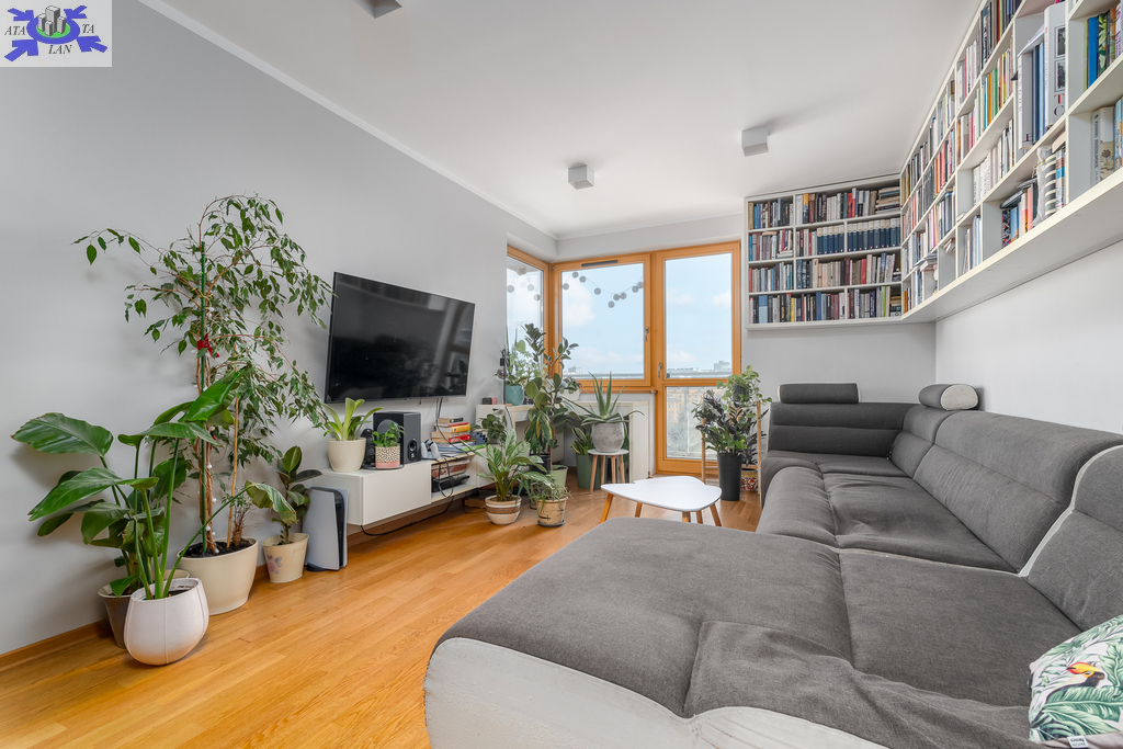Salon z aneksem kuchennym (30 m2) - przestronny, jasny, z dużymi oknami i wyjściem na narożny balkon.