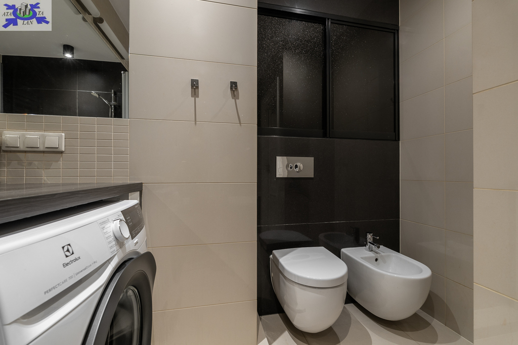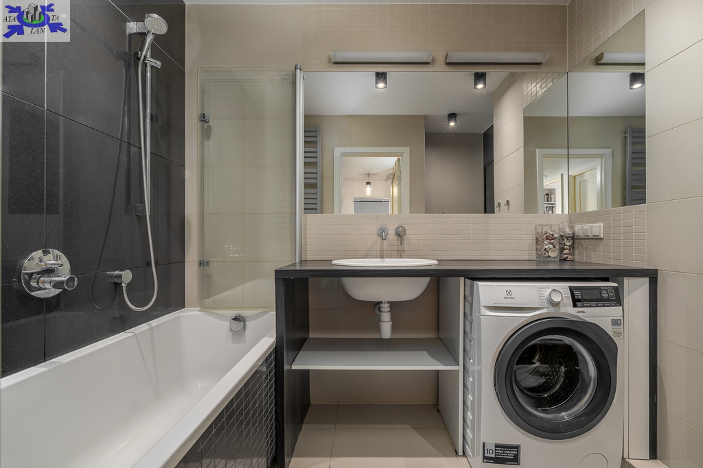 Łazienka (ok. 6 m2) - nowoczesna, z wanną/prysznicem, umywalką, toaletą, bidetem i pralką.