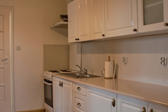 Kuchnia wyposażona jest w kuchenkę elektryczną z piekarnikiem, pochłaniacz, nowe białe meble kuchenne i lodówkę .