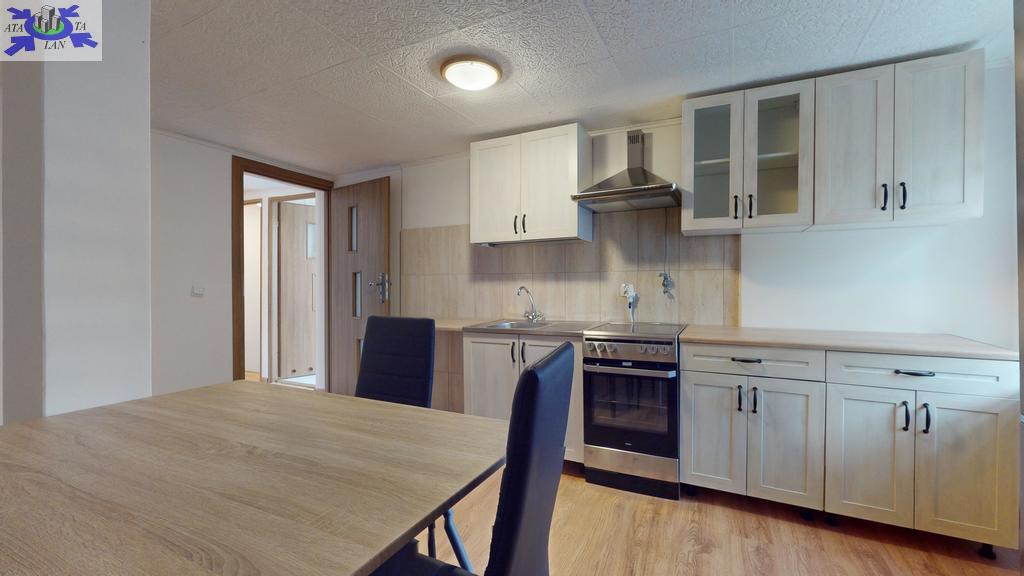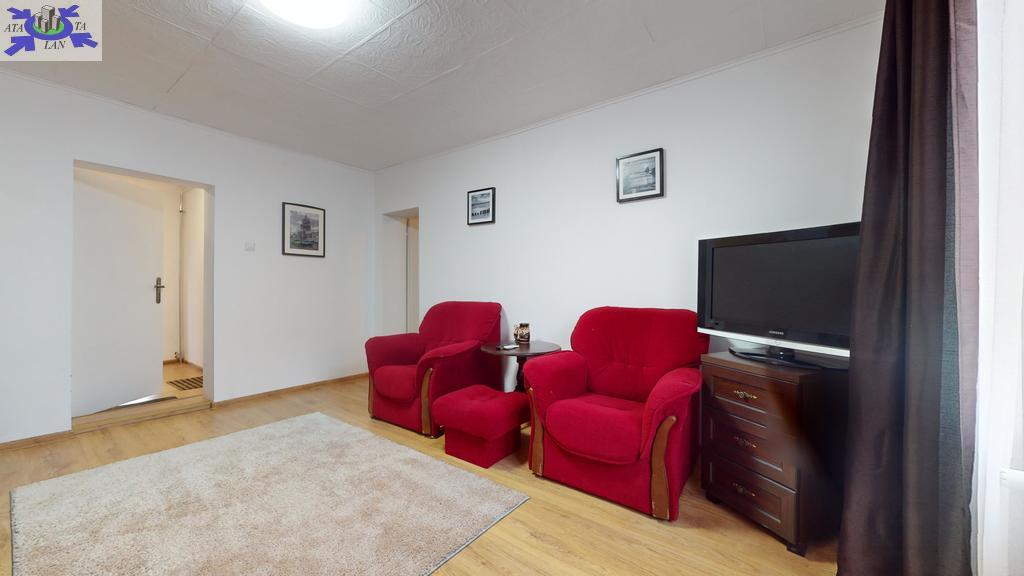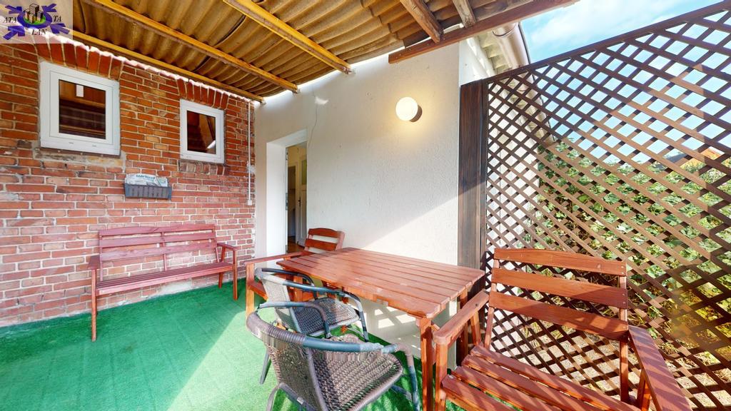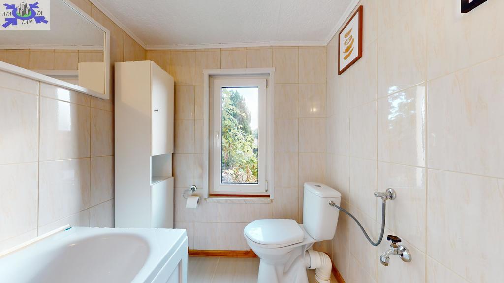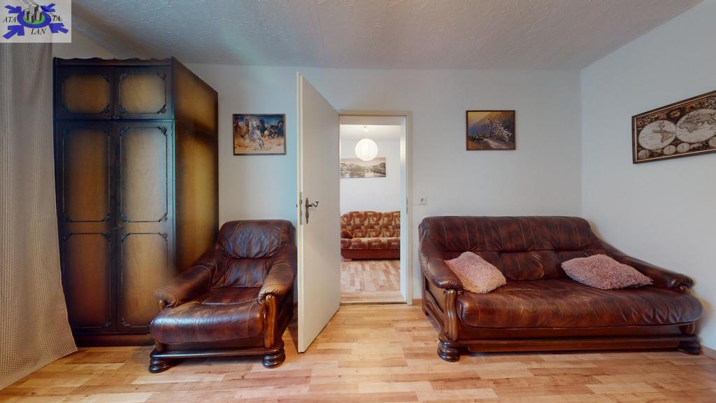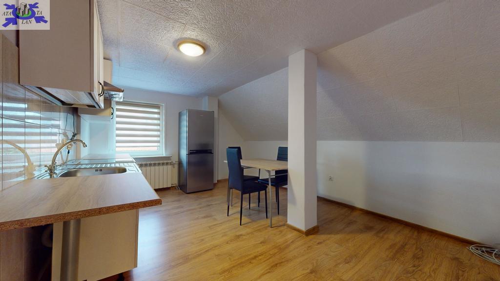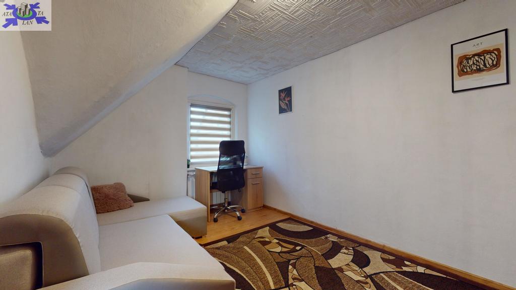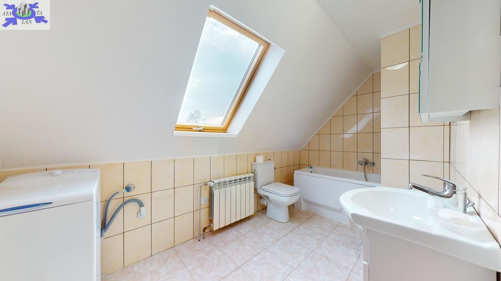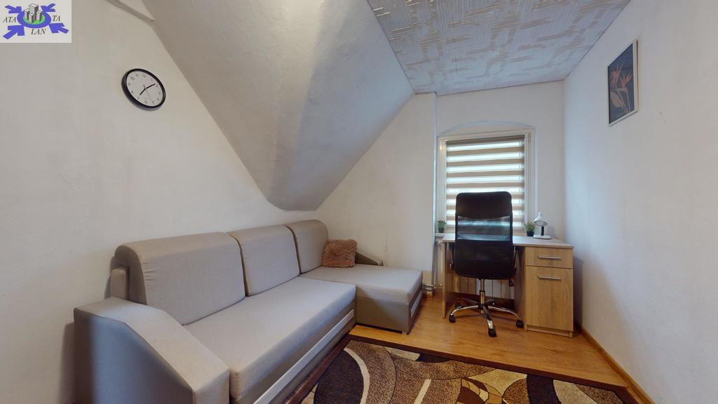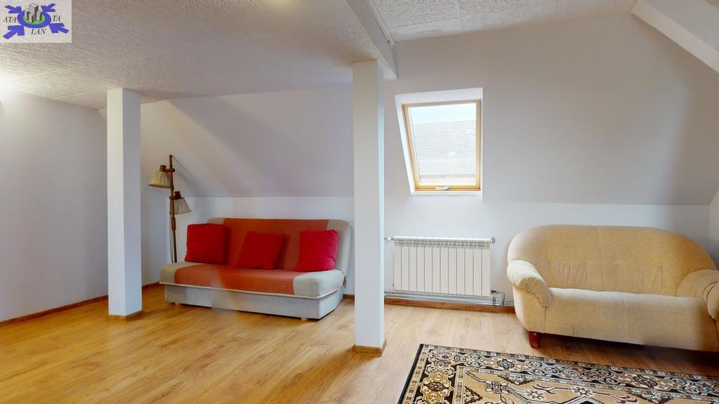Na poddaszu jest trzecie mieszkanie z dużym pokojem dziennym, sypialnią, kuchnią i łazienką.