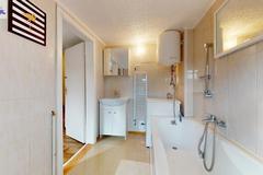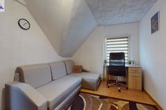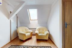 Na poddaszu jest trzecie mieszkanie z dużym pokojem dziennym, sypialnią, kuchnią i łazienką.