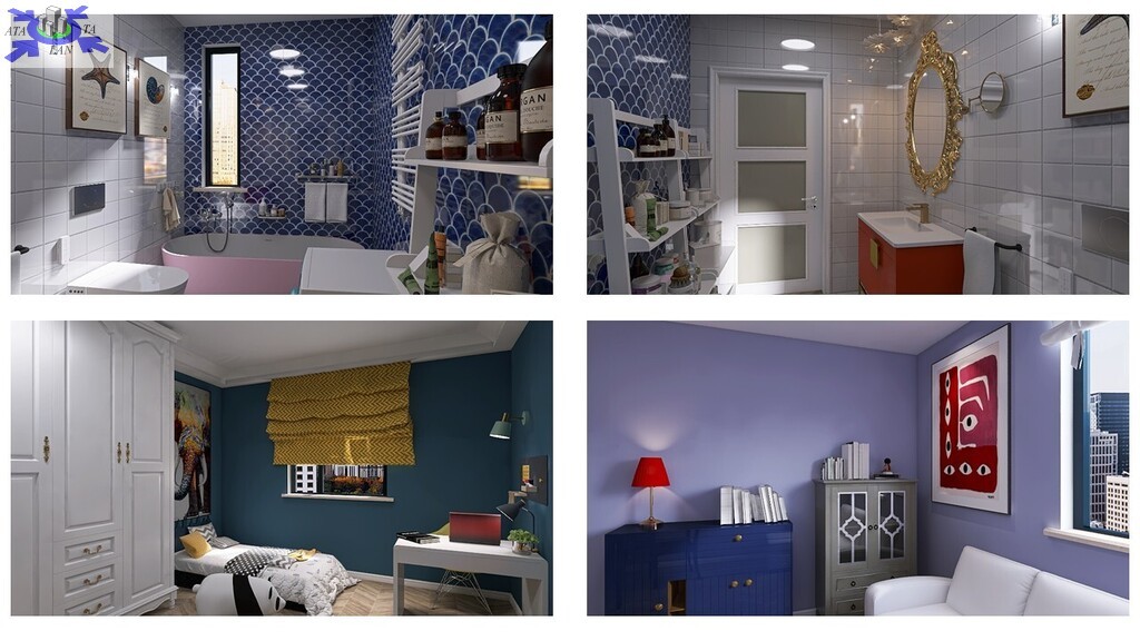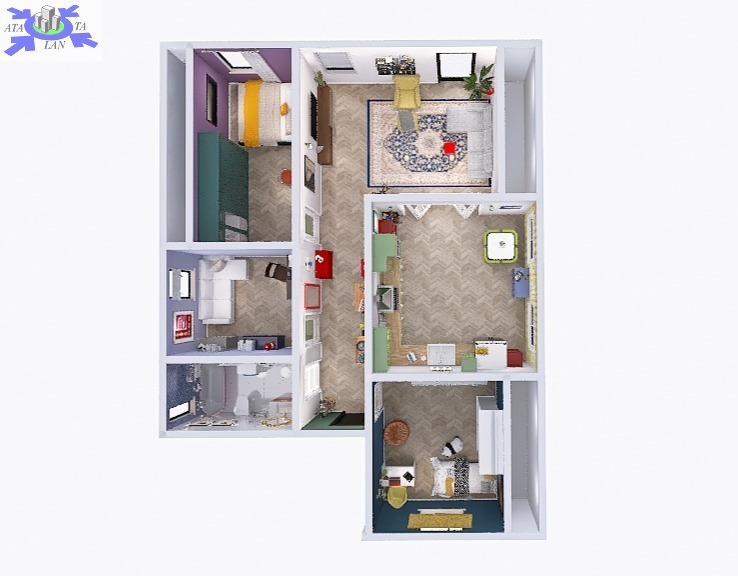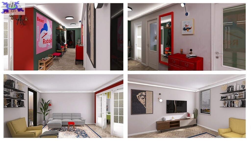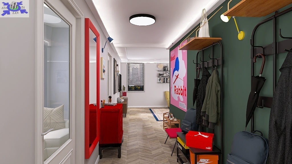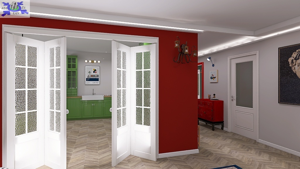 Przy obecnym układzie mamy klasyczny, duży przedpokój z którego wchodzi się do łazienki, kuchni, salonu i trzech sypialni, przy czym ta położona obok salonu jest przechodnia (piękne, duże, drewniane drzwi prowadzą do salonu). Jest wiele możliwości aranżacji pomieszczeń - w przykładowej wizualizacji wykorzystano koncepcję w której kuchnia zostaje przeniesiona właśnie do tej sypialni otwierając się na salon.