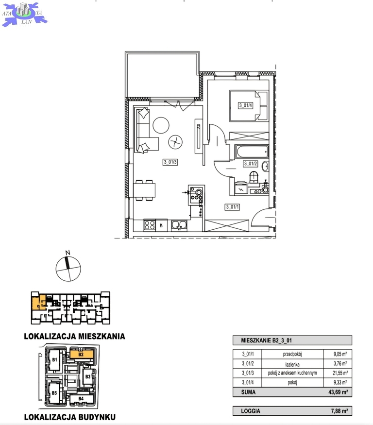 -salon z aneksem kuchennym z wyjściem na balkon 7,88 m2 ,