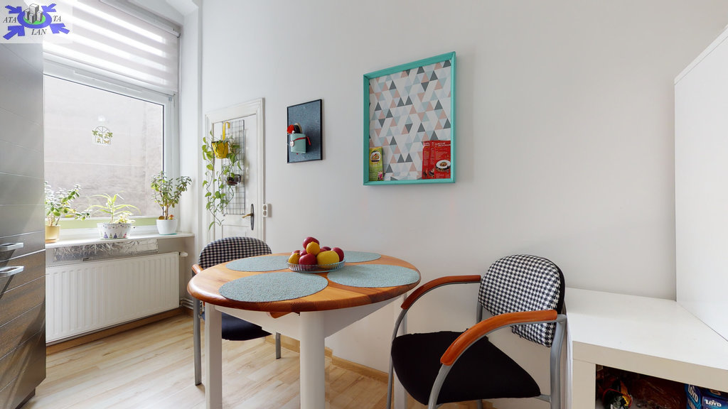 - łazienka - po generalnym remoncie, z dużym oknem, położona odrobinę ponad poziomem całego mieszkania, dlatego wchodzimy do niej po oryginalnych drewnianych schodach.