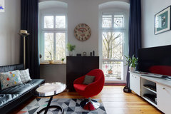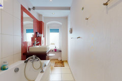 - łazienka - po generalnym remoncie, z dużym oknem, położona odrobinę ponad poziomem całego mieszkania, dlatego wchodzimy do niej po oryginalnych drewnianych schodach.