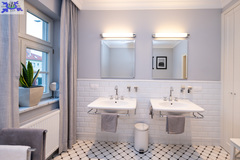 To wnętrze, które zachwyca dbałością o detal i ponadczasową klasą. Dominuje piękna, olejowana deska dębowa na podłogach, wysokie listwy przypodłogowe, sztukaterie ścienne i sufitowe, klasyczne proporcje pomieszczeń. Szaro-beżowa paleta barw przełamana głęboką zielenią i czernią, welurowe sofy, żyrandole w stylu glamour, kominek wolnostojący w salonie. Kuchnia otwarta na jadalnię w bieli i drewnie,. Łazienki wykończone marmurem i mozaiką w stylu retro (wanna wolnostojąca na lwich łapach, baterie w chromie).