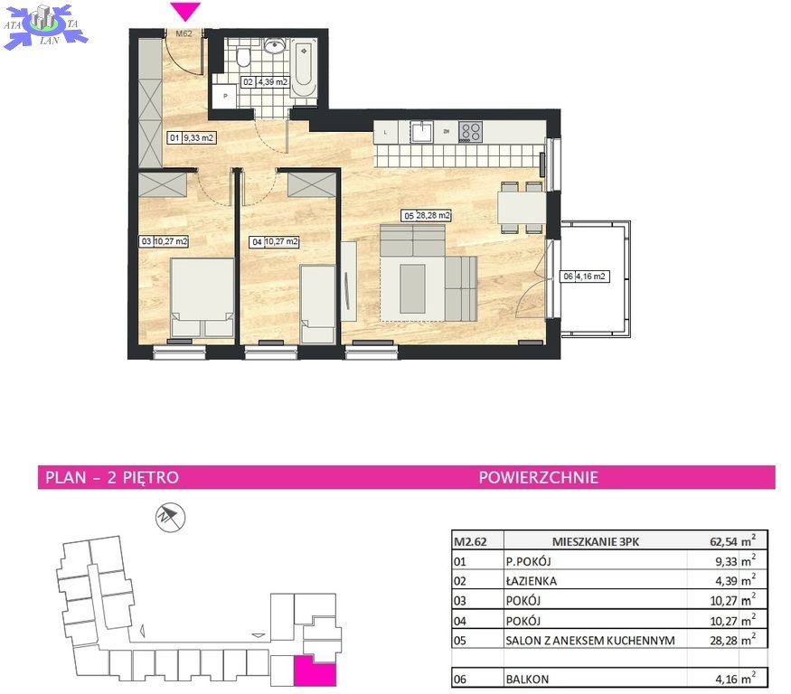 W skład powierzchni 62,54 m2 wchodzą