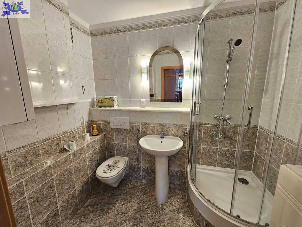 I poziom - 87 m2 kuchnia kompletnie umeblowana meblami na wymiar z pełnym wyposażeniem (lodówko-zamrażarka, kuchenka elektryczna, płyta grzewcza, zmywarka, pralka), mniejsza łazienka z kabiną prysznicową, pokój dzienny o pow. 24 m2 z balkonem oraz 2 niezależne pokoje o pow. 15 m2 każdy. W zabudowie szafy typu "komandor" - w przedpokoju oraz pokoju na górze.