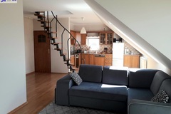 I piętro składa się z salonu z wyjściem na taras od strony zachodniej, aneksu kuchennego, łazienki z wc, w której znajduje się piec gazowy, przedpokoju, sypialni z przejściem do mniejszego pokoju, który pełni funkcję biura.