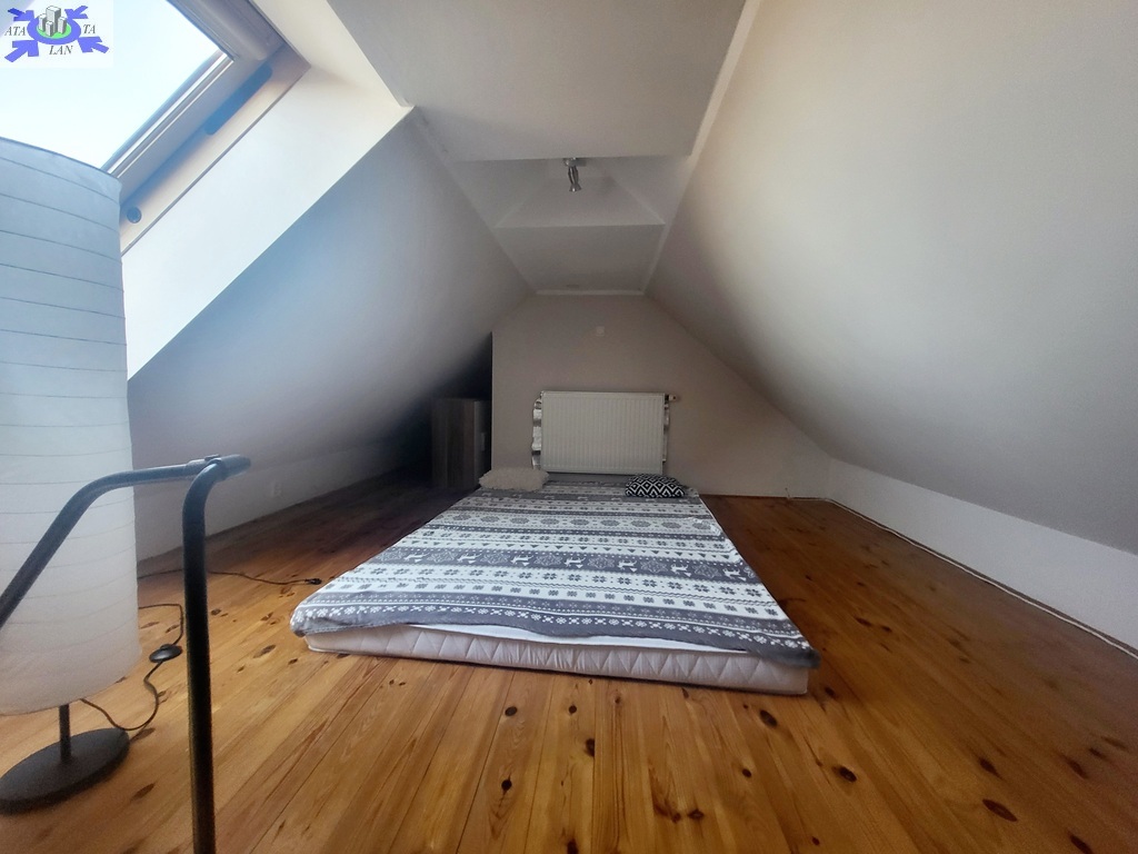 I piętro składa się z salonu z wyjściem na taras od strony zachodniej, aneksu kuchennego, łazienki z wc, w której znajduje się piec gazowy, przedpokoju, sypialni z przejściem do mniejszego pokoju, który pełni funkcję biura.